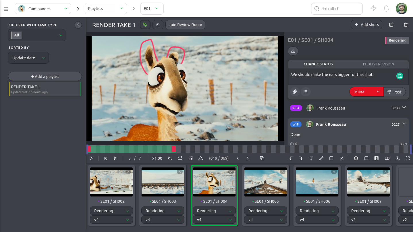 The review engine is perfect to quickly annotate frames and add comments on precise shots: