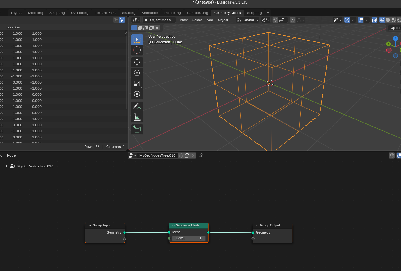When you run this script, you'll have a functional (though simple) geometry node setup that subdivides any geometry it's applied to: