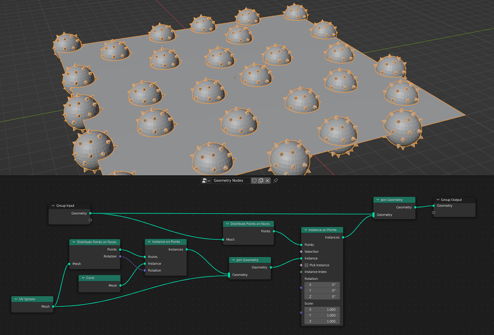 For instance, Distribute Points on Faces generates evenly or randomly placed points across a surface, which can then serve as placement positions for instances like grass or particles.