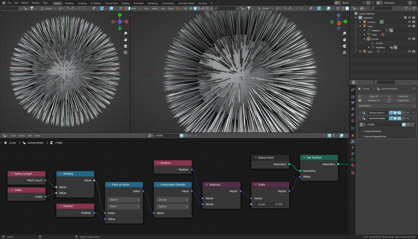 Each node performs a small task, but when connected, they can create incredibly detailed results: from forests made of thousands of randomized trees to animated particle trails or architectural patterns. Geometry Nodes allow you to build once and control everything with adjustable parameters.