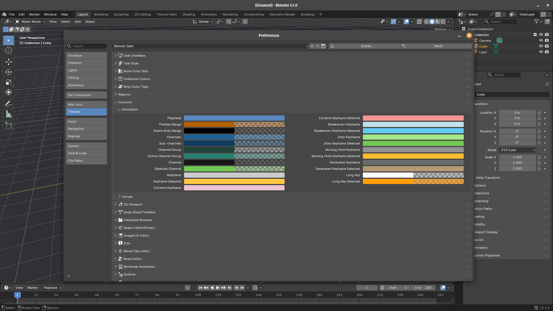The Themes section exposes every color used across Blender's interface, organized by editor type: 3D Viewport, Node Editor, Timeline, Properties, and so on.