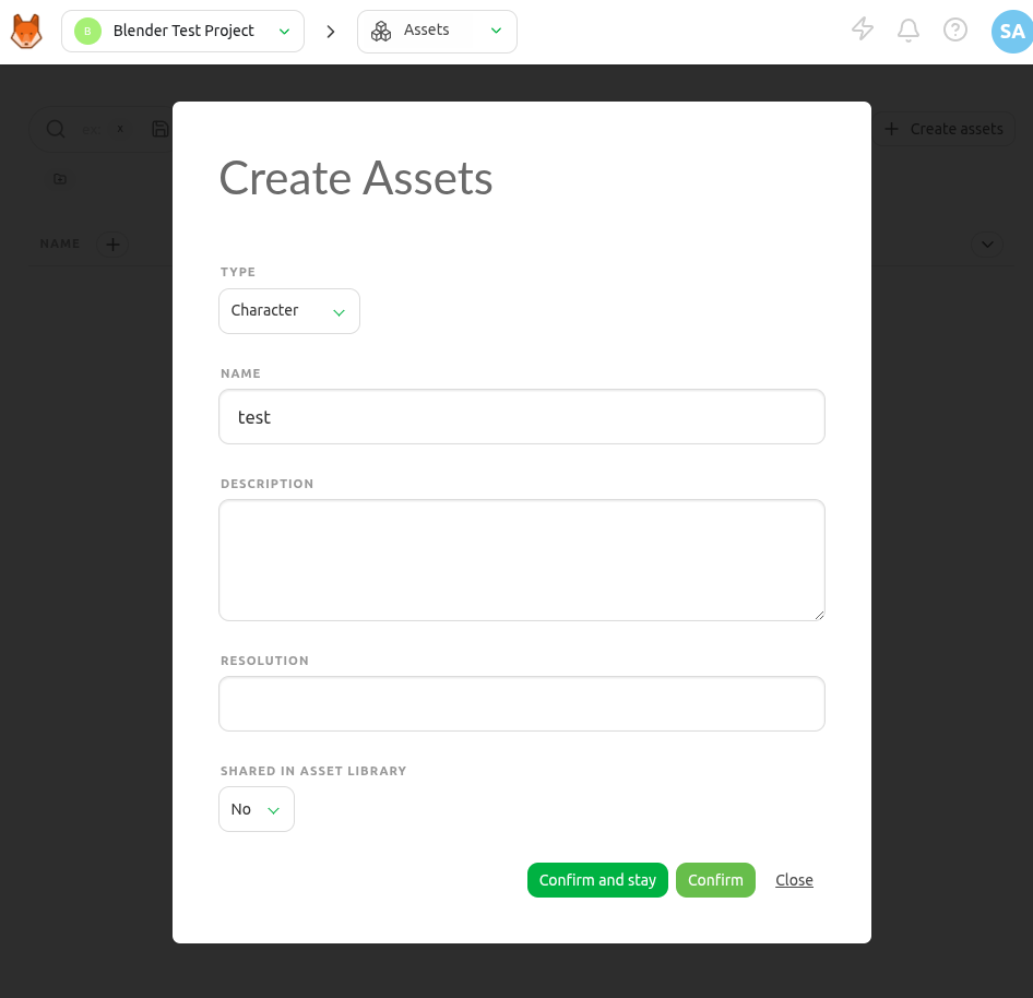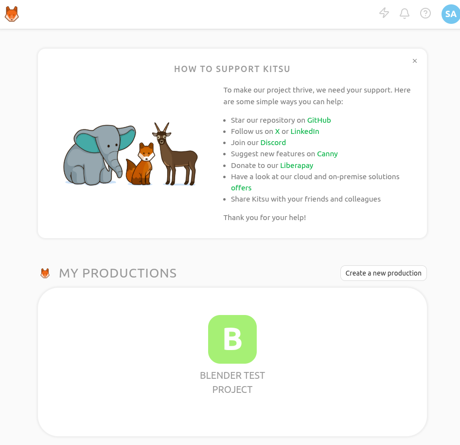 - Create a new production (e.g., Blender Test Project) by going to the "Productions" page from the sidebar.