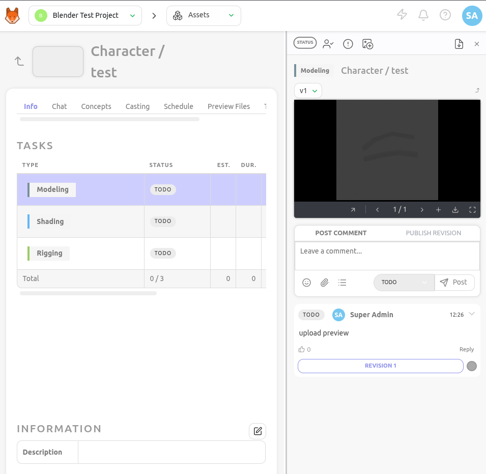 python3 upload.pyOnce uploaded, the file becomes instantly available in Kitsu’s web interface. Supervisors can review it, leave feedback, and mark statuses—all without any manual file juggling from the artist.