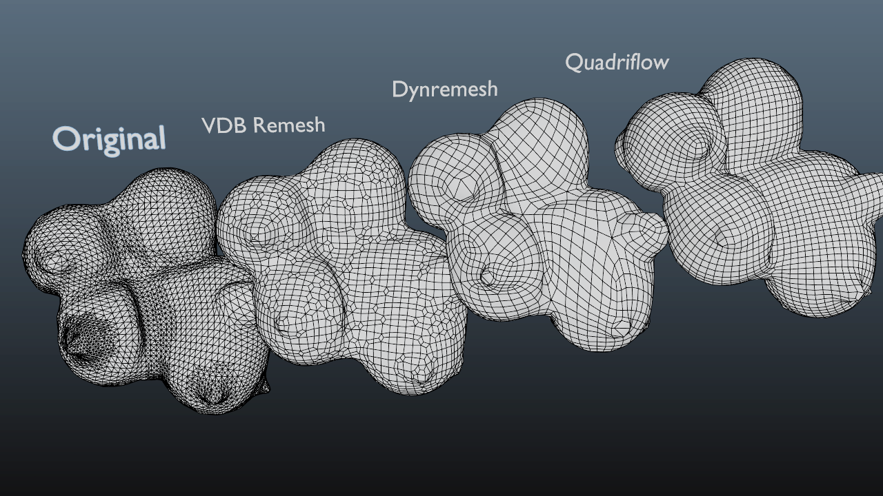 Voxel remeshing (VDB Remesh) works by converting the mesh into a 3D grid of tiny cubes (voxels), rebuilding the surface based on volume rather than original edge flow.